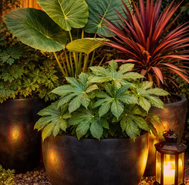 In the Pacific Northwest, this works especially well because many tropical-looking plants thrive with our mild temperatures, cool nights, and long growing season. The key is not chasing true tropicals that struggle here. The better strategy is to combine cold-hardy structural plants, oversized foliage, warm materials, and simple lighting so the space feels tropical even in a regional climate.