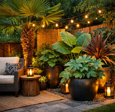 A successful tropical patio corner usually needs only five things: height, bold foliage, a warm base layer, soft lighting, and one visual focal point. Height gives privacy and enclosure. Bold foliage creates the tropical effect. A warm base layer such as wood, gravel, dark mulch, or an outdoor rug makes the space feel finished. Lighting extends the usefulness of the area into the evening. A focal point keeps the design from looking accidental.