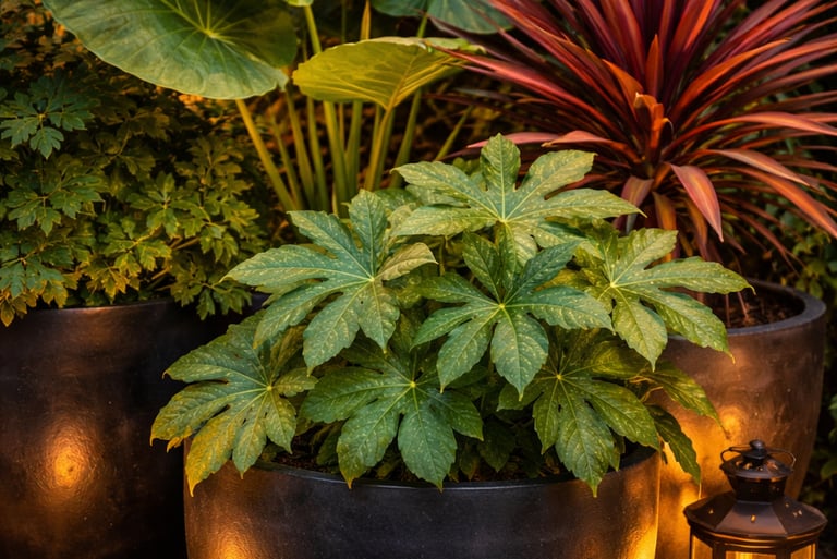 Also pay attention to leaf shape contrast. A tropical look becomes much stronger when fan shapes, broad leaves, and strappy upright foliage are layered together. That contrast creates the visual richness people respond to.