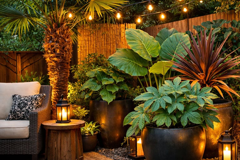 One common mistake is placing tropical-style plants randomly around a patio instead of grouping them into one visual zone. Grouping creates impact. Scattering weakens it.