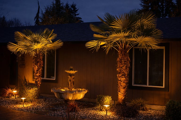 If you have a windmill palm or another structural plant, place a warm uplight low enough to cast light up through the trunk and into the canopy. That gives the plant a stronger silhouette and instantly makes the yard feel more dramatic.